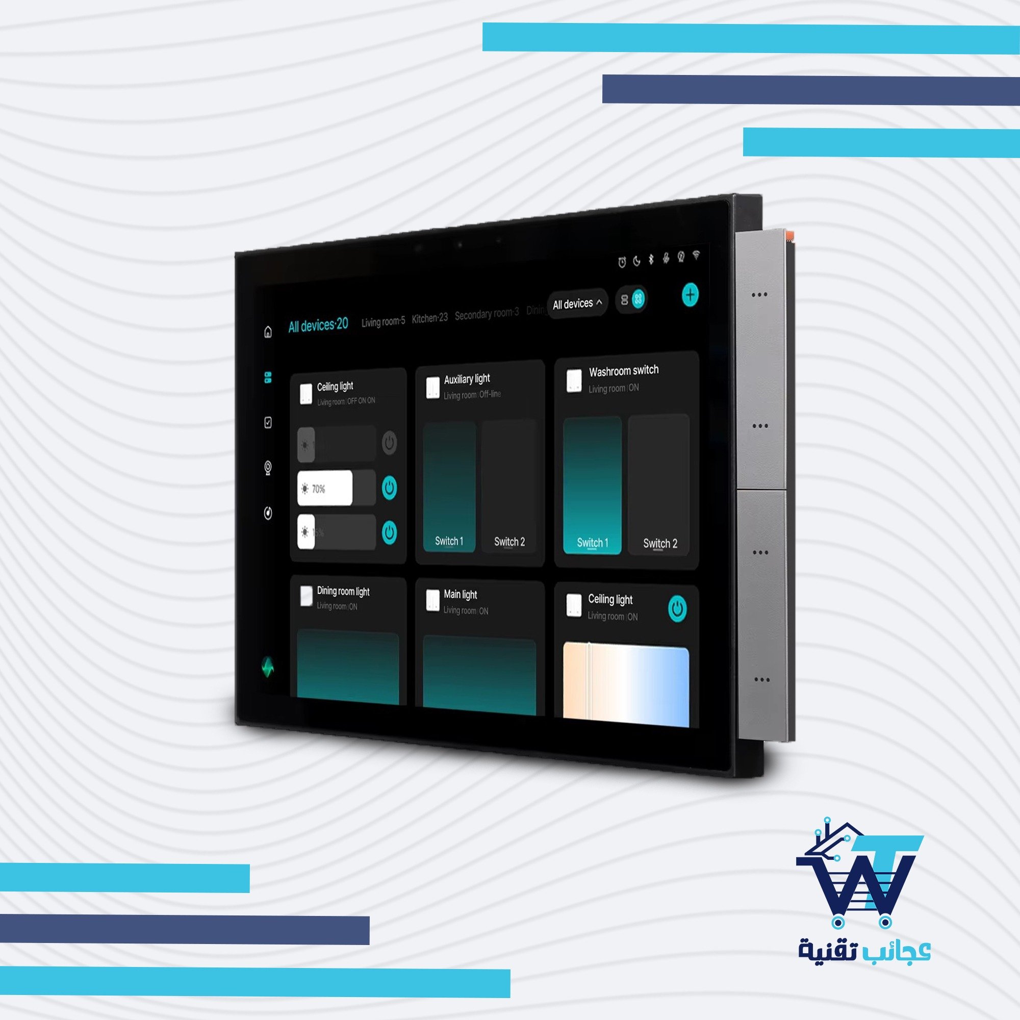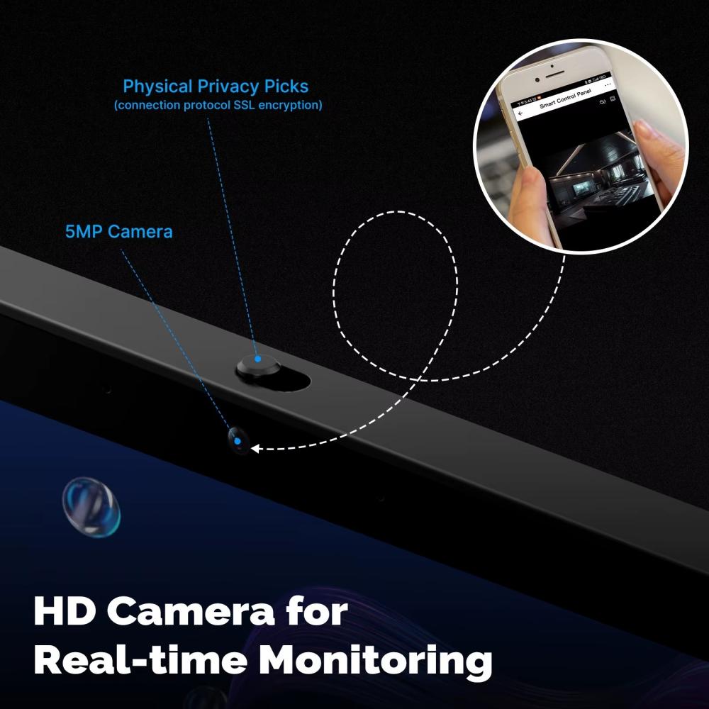 لوحة التحكم الذكية هي المركز الرئيسي لبيتك الذكي. شاشة لمس 5 إنش أنيقة تُركّب على الجدار، تجمع لك التحكم بالأجهزة، المشاهد، الكاميرات، الجرس الذكي، وحتى الأوامر الصوتية… وكل هذا من جهاز واحد بدون تعقيد.